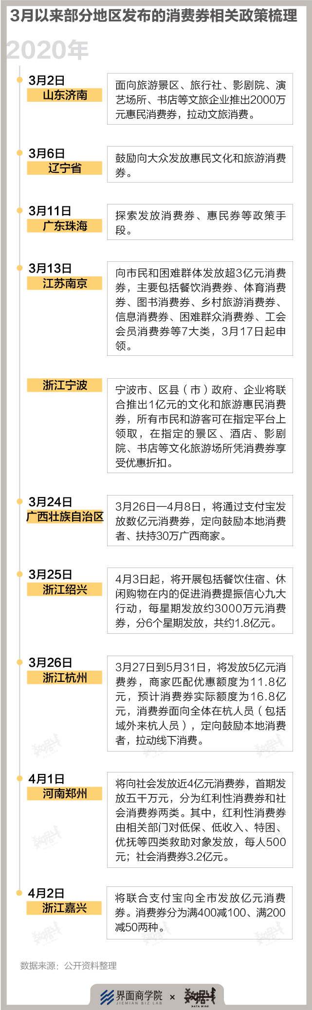 今年3月以来,已经有包括济南、南京、宁波在内的多个地方表示将发放以促进文旅消费为主的消费券推动消费回补,总额从千万元到亿元计。