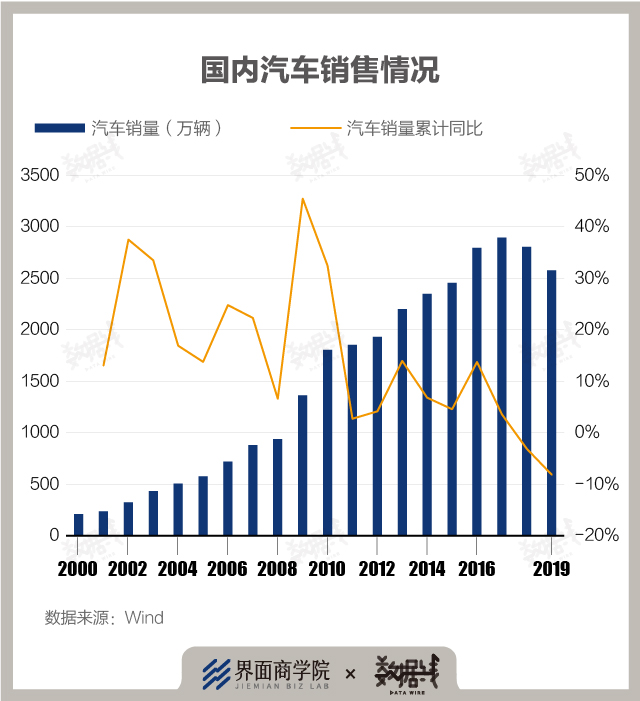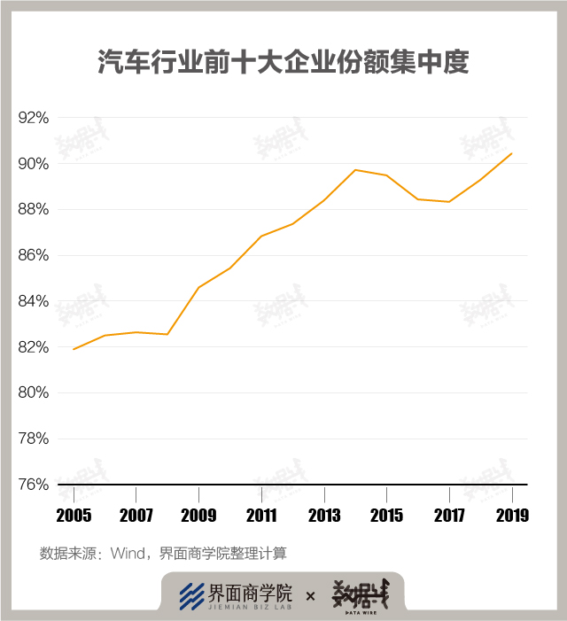 对于汽车行业来说,虽然在消费中占比持续走高,但也面临着同家电一样增速持续回落的情况。2011年后,车企集中度逐步提高,而且在阶段性产能过剩、市场竞争加剧的影响下,高增长的行业红利似乎逐步消退,销售增速回落至个位数,甚至出现负增长。