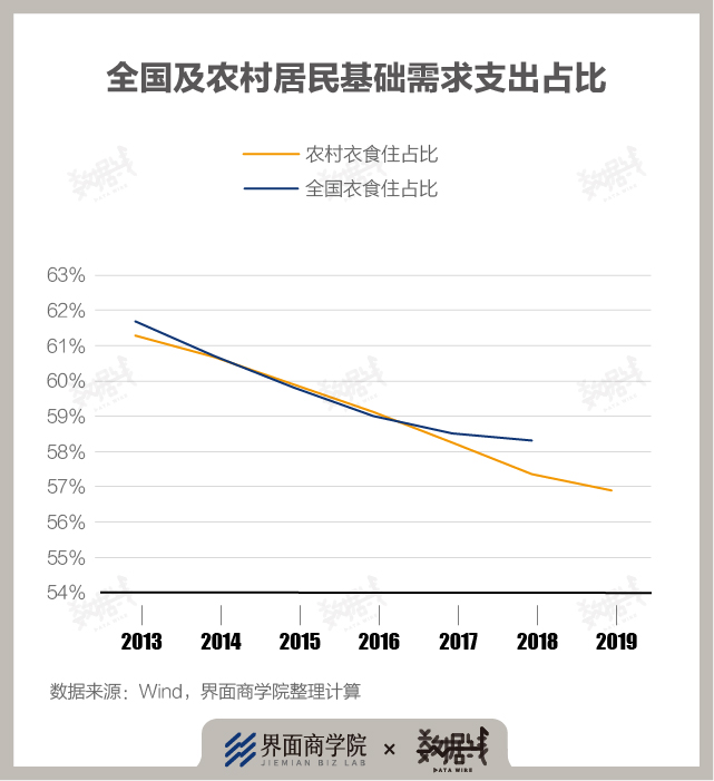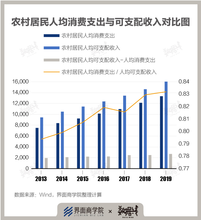 但是,农村居民消费已经没有太多可以拓展的空间。自2013年城乡入户调查数据公布,尽管农村居民人均可支配收入增速持续快于城镇居民,但农村居民人均消费支出在人均可支配收入中的占比已经持续上升至83%。