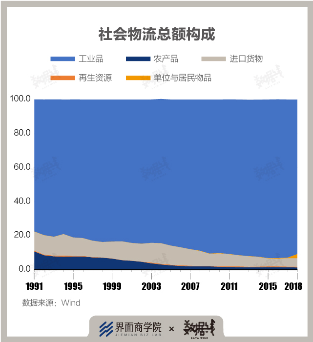 但是,从物流总额构成来看,目前工业品仍占据绝对优势,虽然近年比重有所下滑,但2018年仍高达90.7%,而农产品比重有所回落,2018年仅为1.4%。从增长率来看,2012年以来,农产品物流总额同比增速维持在4%左右的低位,2018年仅为3.5%,不仅比社会物流总额同比增速低3个百分点,也是所有品类中增速最低的。