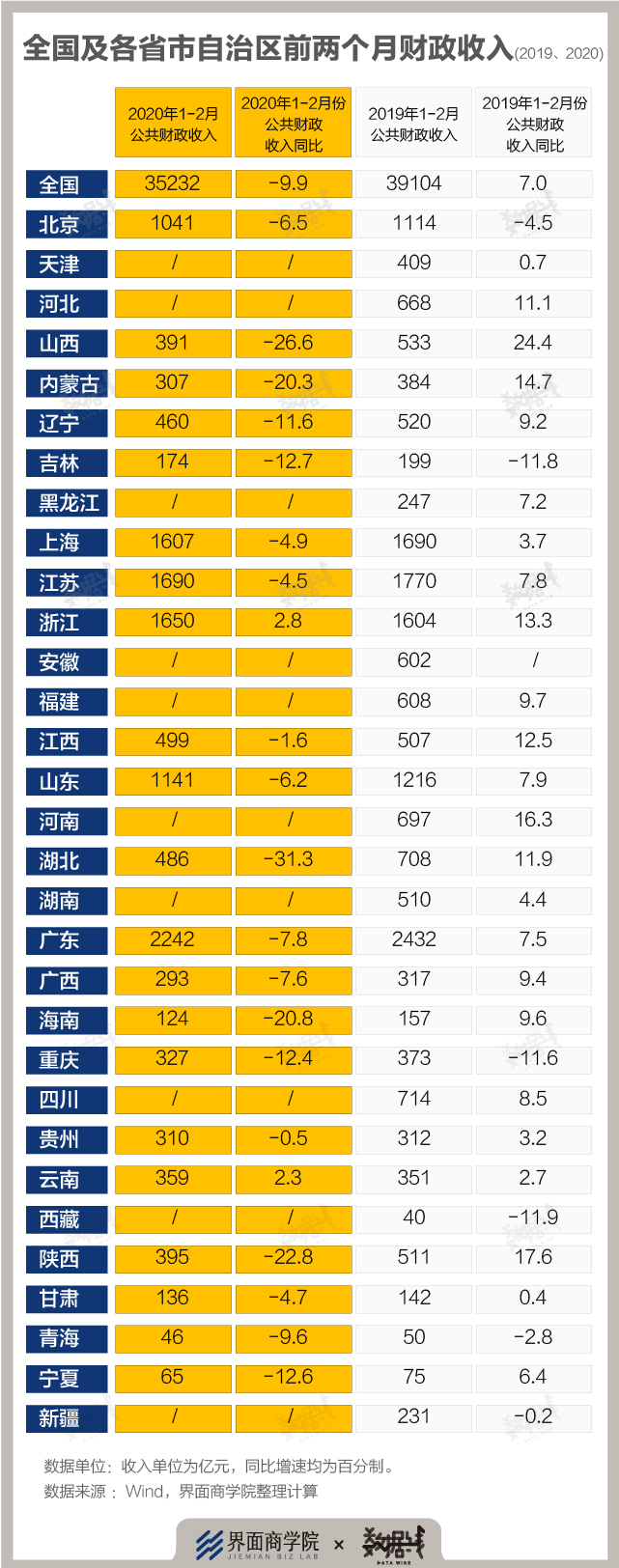 1-2月份的经济数据大幅下滑,社会消费品零售总额同比名义下降20.5%、规模以上工业增加值同比实际下降13.5%、全国固定资产投资(不含农户)同比下降24.5%。受疫情冲击,税基大幅缩水。1-2月累计,全国一般公共预算收入同比下降9.9%,税收收入同比下降11.2%,但非税收入同比增长1.7%。