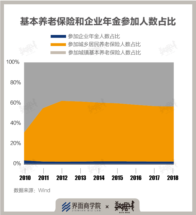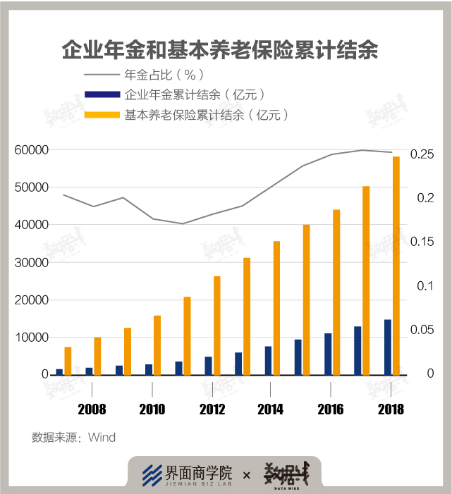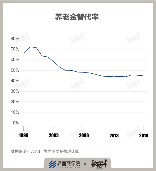 当然,我们计算的只是基本养老保险这个“第一支柱”的替代率,还要考虑“第二支柱”企业年金和职业年金,以及“第三支柱“商业养老保险(包括税收递延型养老保险)等。但从累计结余来看,截至2018年末,基本养老保险为58152亿(其中城镇职工养老保险为50901亿,城乡居民养老保险为7250亿),企业年金为1.48万亿,为基本养老保险的25%左右,职业年金约6000亿元,但其仅覆盖机关事业单位工作人员。此外,由于税收递延型养老保险2018年才开始试点,参保人数和保单收入几乎可以忽略不计。