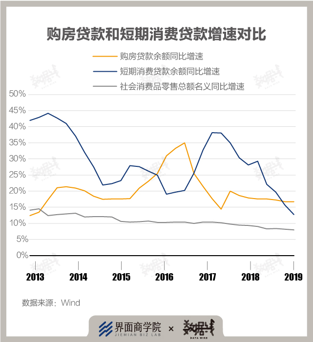 购房贷款的高比重和高增长,不仅导致中低收入群体还本付息压力增大,也会对其他消费贷款带来“挤压”,进一步抑制消费。从购房贷款余额和短期消费贷款余额增速来看,购房贷款余额增速的上行往往带来短期消费贷款余额增速的下行,但2017和2018年出现了购房贷款余额增速大幅下行、社会消费品零售总额增速下行但短期消费贷款余额增速大幅上行的反常局面。2017年短期消费贷款余额增加18728亿,同比多增超过1万亿。消费贷款的高增长并没有带来消费的高增长,可能意味着当年地产调控政策限制了购房贷款,导致短期消费贷款大量违规流入房地产领域。