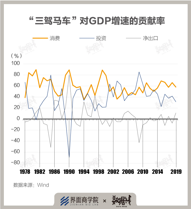 随着消费率的上行,消费对国民经济的贡献率也在提高。2011年以来(2013年除外),消费对GDP增速的贡献率一直超过固定资本形成总额(即严格意义上的“投资”),2019年达到57.8%,远超固定资本形成总额的31.2%和净出口的11%。