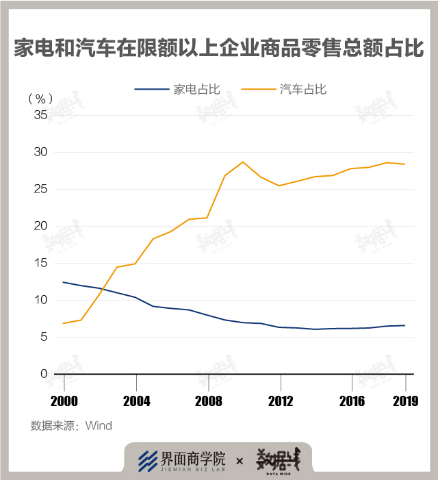 家电在限额以上企业商品零售额中的占比由2000年的12.4%下滑至2019年的6.6%,而汽车占比由2000年的6.9%大幅提升至2010年的28.7%,随后十年高位震荡,2019年为28.4%,汽车消费成为带动消费的核心力量。