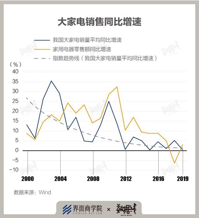 从家电行业来看,在存量市场得到满足后,行业利润率回落、集中度提升。近年由于地产政策调控,增量需求承压,导致行业增速进一步放缓。我国大家电(统计包含彩色电视机、家用电冰箱、空调、家用洗衣机四项)销量平均增速自2000年以来整体处于下滑趋势,不过近年已趋于稳定。