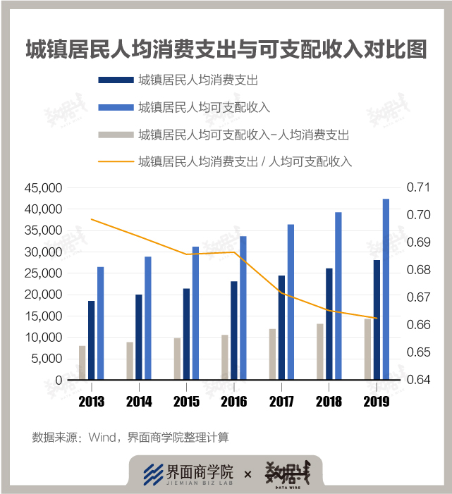 相反,占全部人口60.6%的城镇常住人口的消费拓展空间相对更大。2013年以来,城市居民的人均消费支出与人均可支配收入的比值持续下降,至2019年已经降到了66%。