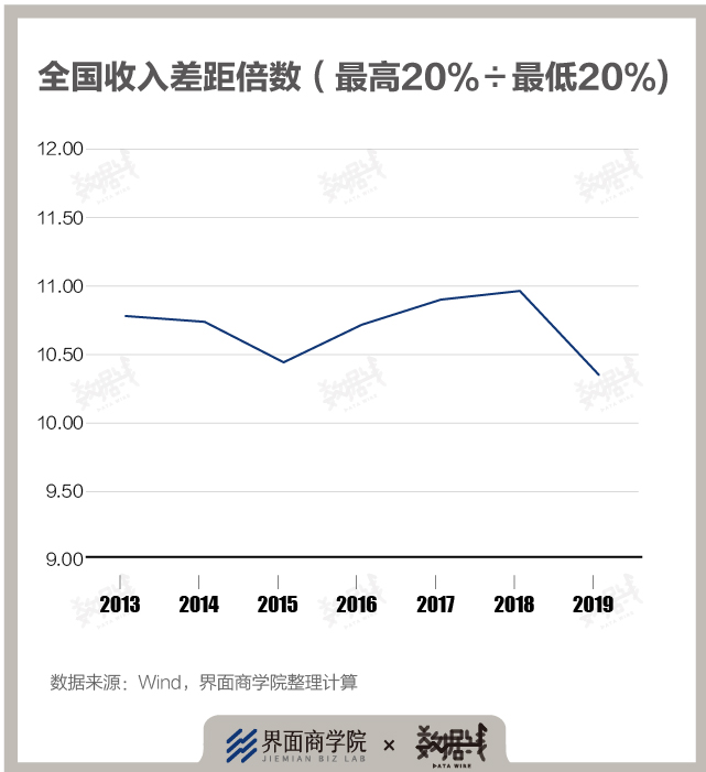 从20%高收入户与20%低收入户的收入差距倍数来看,2015年也出现了上行,从2015年的10.45倍上升至2018年的10.97倍。