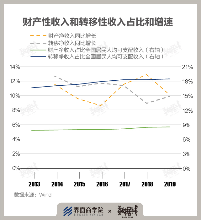 除了继续提升工资性收入和转移性收入,从消费降级到消费升级更需要加大财产性收入的比重。2019年,全国居民财产净收入仅为2619元,占人均可支配收入的比重仅为8.5%,而且10.1%的增速也较2018年下降2.8个百分点。