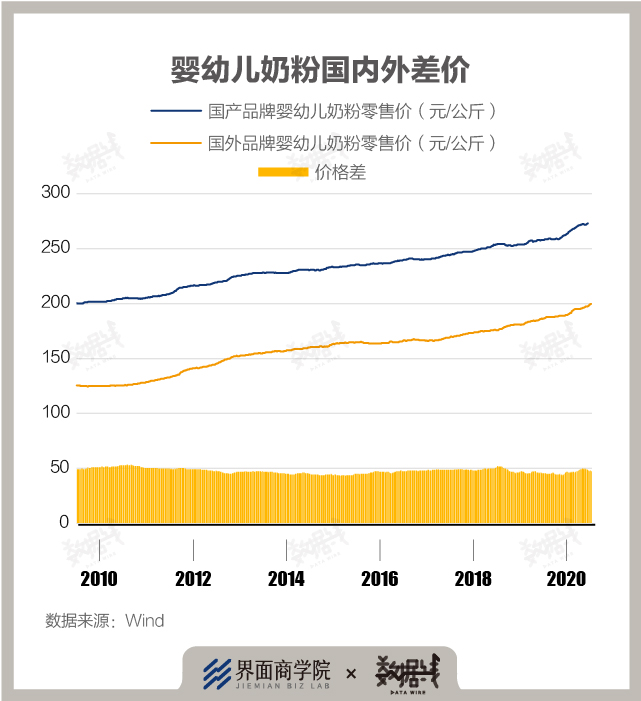由于商品和服务质量以及品牌价值的“双重差距”,日用消费品领域成为中国产品的“软肋”。以婴幼儿奶粉为例,过去十年来,尽管国产品牌的价格也在上涨,但与国外品牌的价格之差长期稳定在50元/千克左右。