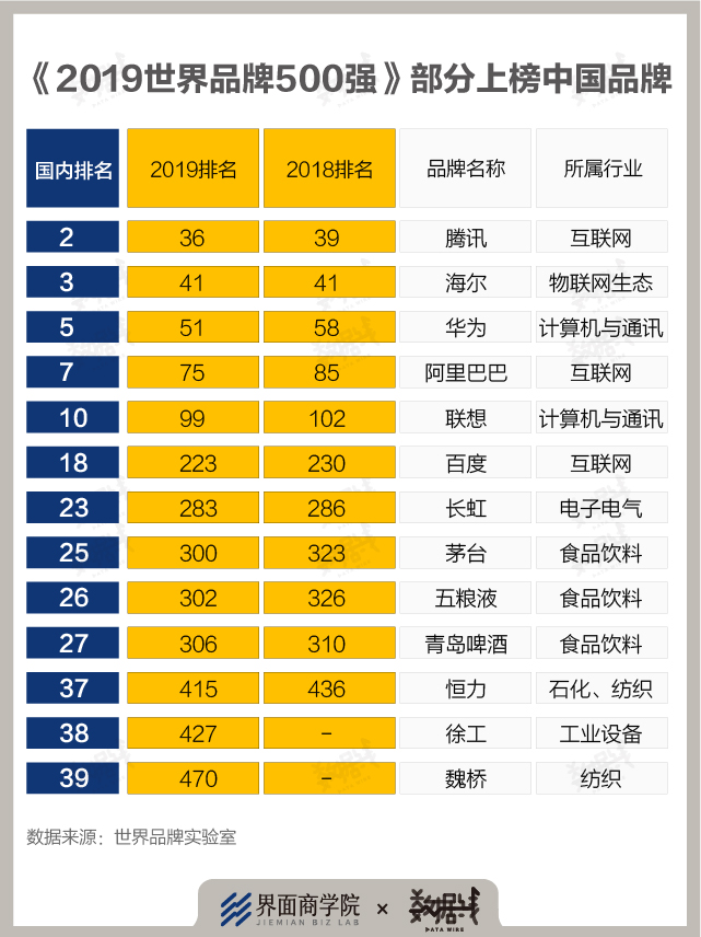 从企业品牌价值来看,中国公司也有较大差距。世界品牌实验室编制的2019《世界品牌500强》排行榜显示,美国占据500强中的208席,稳居品牌大国第一,中国虽位列第五位,但入选的品牌只有40个,其中超过60%为“中字头”公司,除了酒类,日常消费类公司上榜寥寥无几。