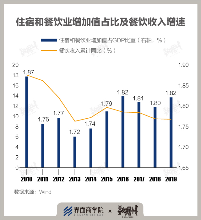 尽管住宿和餐饮业增加值占GDP比例为1.82%、对GDP增速的贡献率为1.88%,落后于批发零售、房地产、商务服务业等其他大类第三产业,但是,住宿和餐饮业的经营主体和从业人员抗风险能力整体较差。天眼查数据显示,餐饮业企业有96.15%是个体工商户,数量达 1069万家。从国家统计局数据来看,2018年住宿和餐饮业就业人员数为3214万人,其中,私营企业和个体就业人数为2945万人。