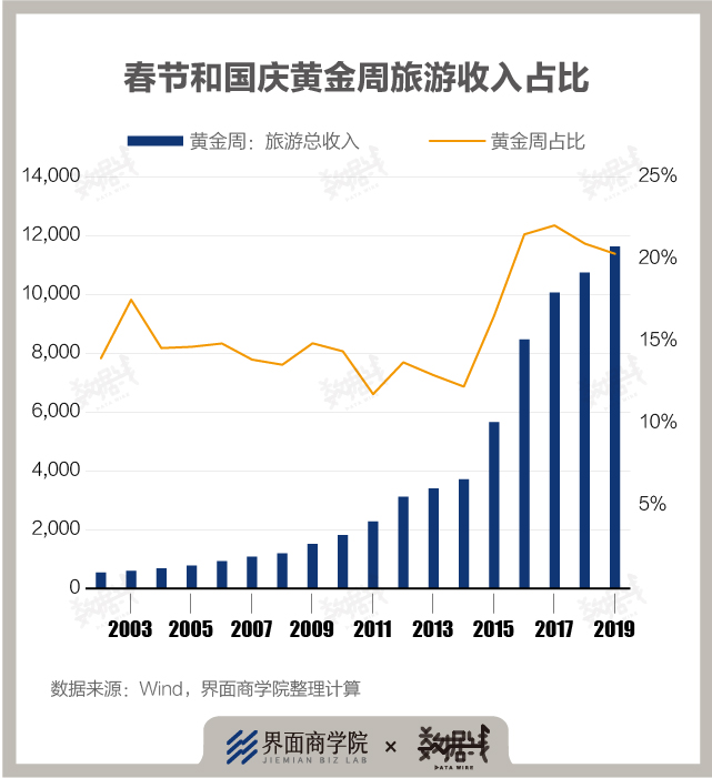 从全国角度看,今年部分小长假也有一定延长。根据去年底国务院的决定,今年五一劳动节从4天延长至5天,国庆节和中秋节也因为重叠而改为连休8天。但2017年以来,黄金周(春节黄金周和十一黄金周)的旅游收入增速和占比均出现了下滑,目前占比为20%,旅游人次增速也位于历史低位,2019年为8%,长假能否带来旅游收入的大幅增长也存在不确定性。