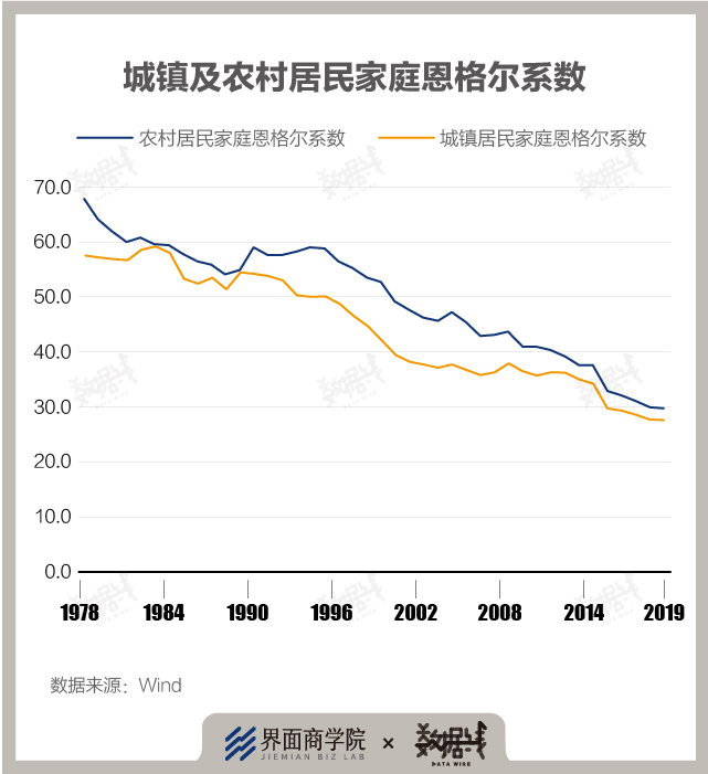 从绝对数来看,2019年,农村居民人均可支配收入为16021元、人均消费支出为13328元、二者之差仅为人均2600元;而城市居民人均可支配收入42359元,人均消费支出28064元,二者之差为14296元。