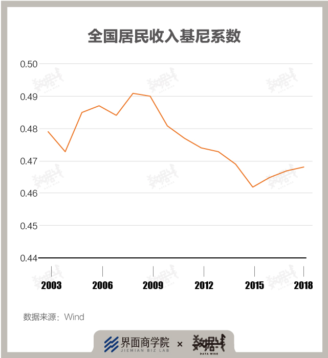 中低收入群体消费降级和中高收入群体消费升级的背后是收入的分化。2015年以来,中国的收入差距形势出现了微妙的变化,基尼系数小幅升高,已从2015年的0.462升至2018年的0.469。