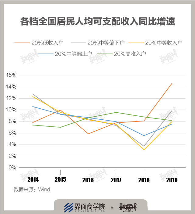 值得注意的是,在经过新一轮个税改革后,2019年,高收入群体收入增速继续小幅下滑,但其他四个群体收入增速均大幅反弹,尤其是低收入群体人均可支配收入增长14.6%,中间偏下群体均可支配收入也增长9.9%。