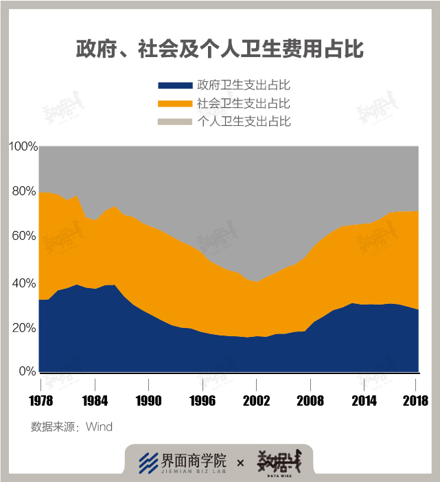 从医疗负担的情况来看,在卫生总费用的构成中,2018年政府支出、社会支出和个人支出占比分别为27.7%、43.7%和28.6%,相比2001年,政府支出和社会支出占比分别上升了11.8个百分点和19.6个百分点,相应个人支出占比下降了31.4%个百分点。但2011年以来个人支出占比下降的速度放缓,政府支出占比也开始下降,社会支出的占比上升了近9个百分点。