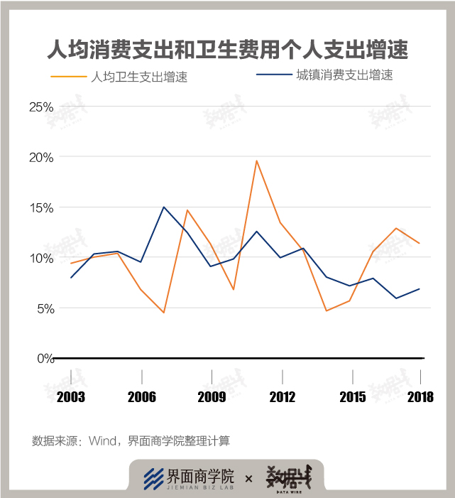 尽管卫生总费用中个人支出比例不断下降,但由于医疗费用的上涨,2014年以来卫生费用个人支出增速显著加快,并高于人均消费支出的增速。