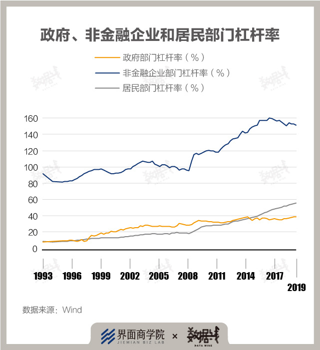 从债务负担的角度来看,居民部门杠杆率从2008年底的17.9%大幅上升至2019年底的55.8%,同期政府部门杠杆率上升10.2个百分点至18.3%,而企业部门杠杆率也大幅上涨56.1个百分点至151.3%,但2017年以来已有所回落。