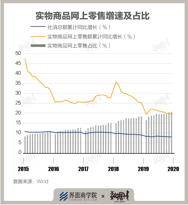 从实物商品网上零售情况来看,尽管其占社会消费品零售总额的比重不断攀升,目前已突破20%,但2015年以来,随着整体消费增速的下行和电商平台流量红利的衰减,实物商品网上零售增速也告别了高速增长,与整体消费的增速差也从最高点的接近37个百分点下降至2019年底的11.5个百分点左右。