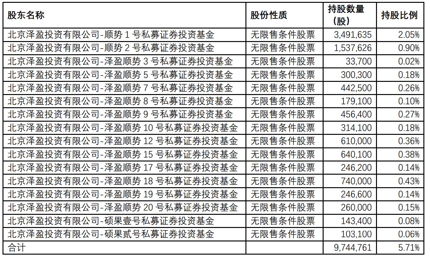 2019年11月4日公司披露称收到北京泽盈投资有限公司(下称北京泽盈)的相关函件,北京泽盈于2019年5月9日至2019年10月30日期间通过旗下16家基金,以集中竞价方式合计增持公司股份974.4761万股,占公司总股本的5.71%,增持均价29.88元。如果该股东手握筹码至今的话,其账面浮盈可想而知。