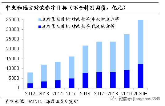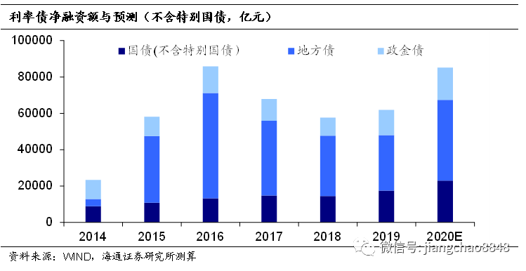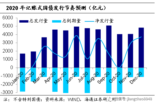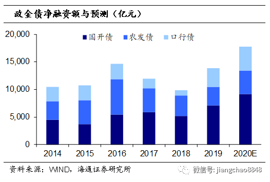考虑到去年国债实际发行量占中央财政赤字目标的比重,预计20年国债(不含特别国债)净融资额2.3万亿,相对于19年增加近5500亿。我们预计今年或将发行1万亿元的特别国债,预计今年国债+特别国债净融资额或达到3.3万亿。