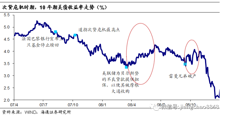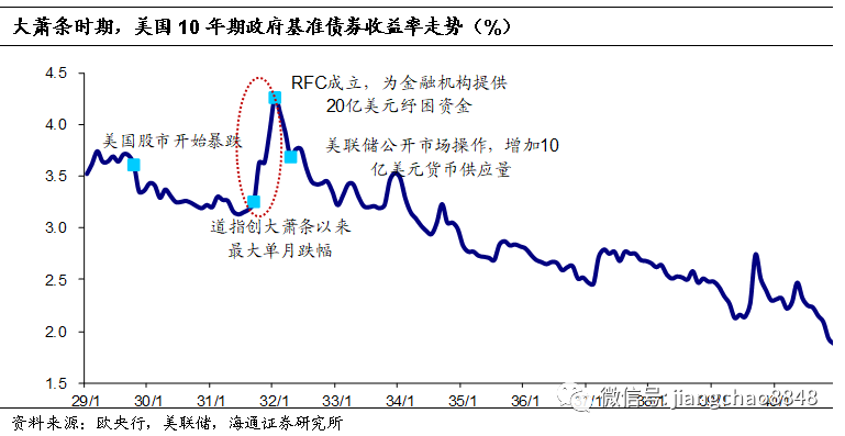 金融危机中的美债走势:大萧条、次贷危机期间,美国国债收益率都是先在避险情绪下逐渐走低;随后出现流动性危机,导致美债被抛售,收益率迅速走高;之后在经济衰退的预期及美联储的引导下收益率再次走低。