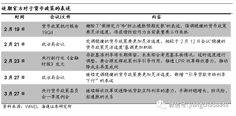 货币更加灵活,态度更为积极。2月以来,官方对于货币政策的定调更加积极。政治局会议定调稳健的货币政策要更加灵活适度;货币政策执行报告删除了“保持定力”和“防止通胀预期发散”的表述,表态将疫情防控作为当前最重要工作来抓;央行副行长发文称,未来综合考虑基本面情况,对存款基准利率适时适度进行调整。