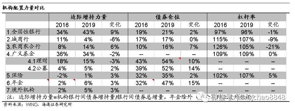 相对于2016年,2019年全国性商业银行、农商农合行、保险、年金、境外机构、公募基金的债券增持力量加大,而城商行、理财对债市的增持力量减弱。对比杠杆率,除保险机构外,其余主要机构的杠杆率均明显下降,其中农商行和农合杠杆降幅最大。对比债券仓位,银行、保险、理财的债券仓位有所增加,但由于银行和理财资产增速明显下滑,因此其债券持仓增速同样明显下滑。