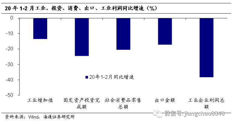 1-2月经济大幅下滑。1月下旬以来新冠肺炎疫情蔓延,政府果断采取各种交通管制和隔离措施,2月全国人口迁徙规模下降了70%,从而迅速控制住了疫情。但是为此付出的代价,则是前两月经济指标,包括零售、投资等同比下滑了约20%,其中2月份的单月降幅或接近50%。