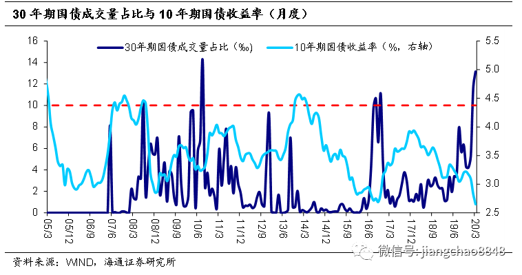 30年国债成交量数据释放牛尾信号。从债市牛熊切换的高频信号来看:牛尾信号一——30年国债成交放量。2008年~2016年的四轮牛市中,有三轮牛市尾声均出现30年国债成交量占比大幅增加,成交占比均在10‰左右,分别领先牛转熊5个月、3个月和当月同步。2月初这一指标飙升至11.6‰、创下2010年9月以来新高,3月继续升至13‰以上、创历史次高。单从这一指标来看,债市牛尾或已到来。