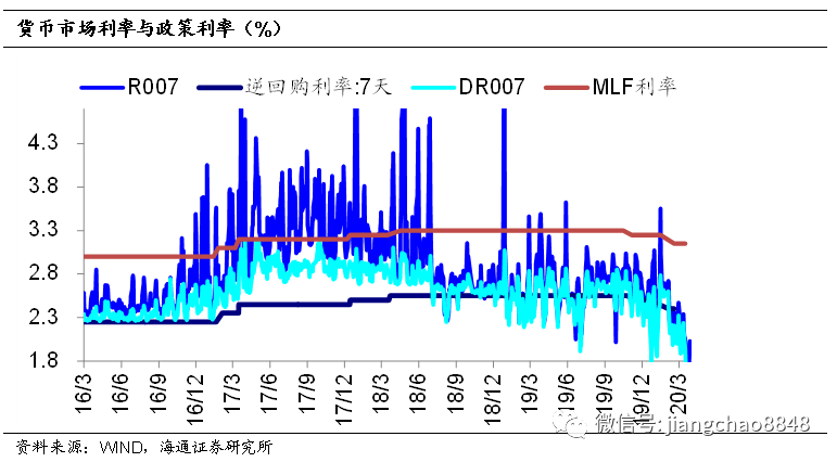 货币宽松对冲疫情。为支持疫情防控,货币政策主要措施包括:(1)加大流动性投放,2月3日和4日公开市场逆回购投放1.7万亿元。(2)引导利率下行,2月下调逆回购、MLF利率10BP,3月30日下调逆回购利率20BP。