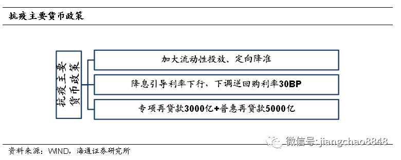 (3)专项再贷款等结构性工具。 2月上旬设立3000亿元疫情防控专项再贷款,企业实际成本平均为1.28%;2月26日增加5000亿元再贷款再贴现额度,并下调支农支小再贷款利率0.25个百分点至2.5%。2020年6月底前,对地方法人银行新发放不高于LPR加50个基点的普惠型小微企业贷款。