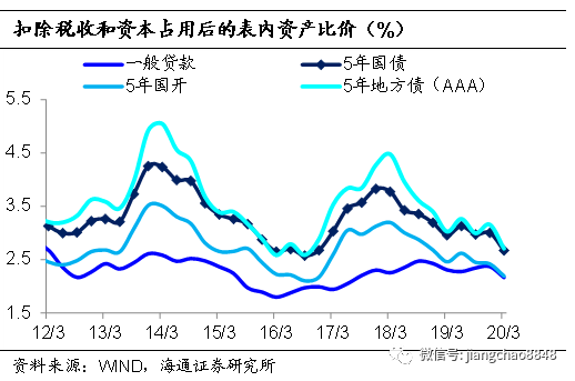 表内配置价值下降,后续多空因素交织。我们测算的一季度5年期国债与一般贷款利率(扣除税收和资本占用)的利差仅50BP、创2010年以来新低。展望2季度,表内利多因素包括:LPR趋降(带动贷款利率下行)提升利率债的配置价值、2020年非标到期量较大、金融监管缓和、经济下行压力压制贷款需求;表内利空因素包括:利率债供给大幅增加、地产融资政策边际放松(房贷相对于国债表内比价已大幅提升)、疫情控制后信贷需求反弹等。