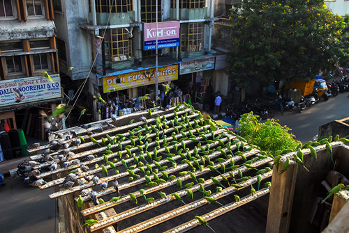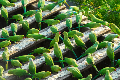 为了喂4000只小鹦鹉,现年62岁的Sekar专门为它们在屋顶搭了一排又一排的架子。