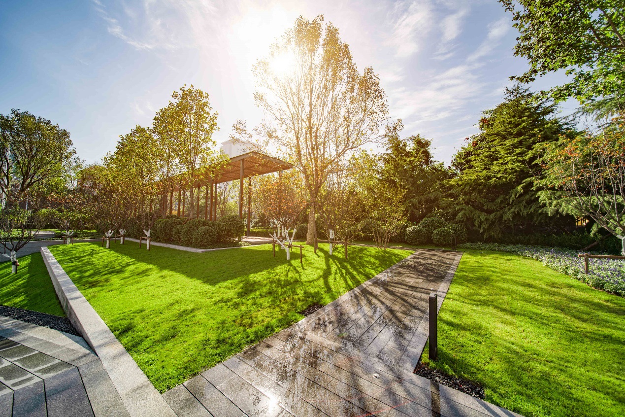 在植物营造中,揽月府不拘泥于树木的茂盛与否,更关注于植物的地域生长力。整体景观错落有致,干净利落,并以“全冠移植”、“先行育林”、“培养土壤”等独特造园技法,营造清幽高雅的园林意境。
