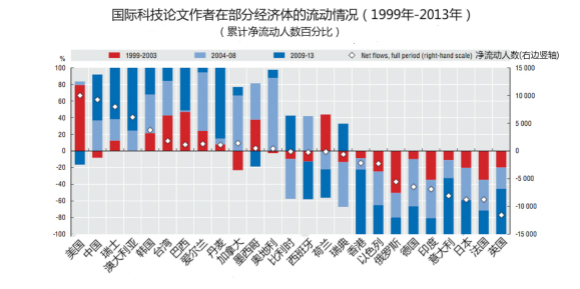 中国成为除美国之外科技论文作者净流入人数最多的国家。在1999年至2003年期间,中国的科技论文作者流出率大于流入率,但从2004年开始,这一趋势扭转过来,在2009年至2013年期间流入率高达90%。