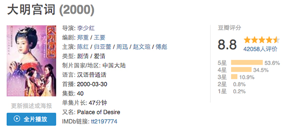 发布会现场,金牌制作人李少红、李小婉回顾了20年来荣信达发生的故事。其中,由陈红、归亚蕾、周迅主演的电视剧《大明宫词》,在当时的央视八套首播时创下了历史纪录,收视率首度破8。而且,其在豆瓣电影上的评分为8.8分,或许是李少红执导作品中评价最高的一部。《大明宫词》之后,《人间四月天》、《橘子红了》又在2001年相继问世。
