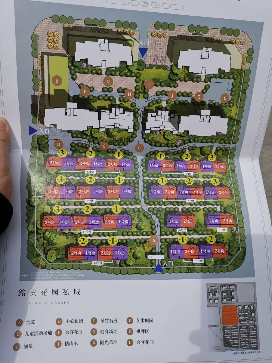在该楼盘平面规划图上可以看到,小区由多栋叠拼别墅、一排洋房、两栋高层组成,平面图上标示着小区内12个景观及设施,入口处有水景;别墅和洋房之间是中心花园、翠竹石庭和艺术庭园;洋房和高层之间则分布着8处设施,包括儿童活动场地、健身场地、棋牌区等区域,以及涌泉、枯山水等景观,还有两个会客花园和一个阳光草坪。