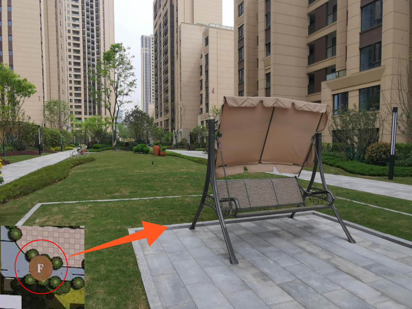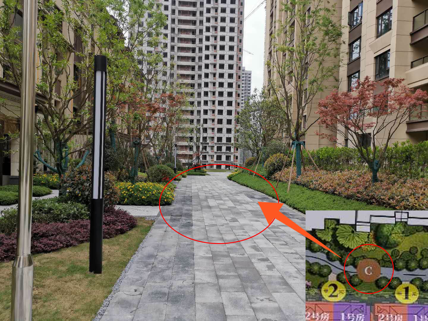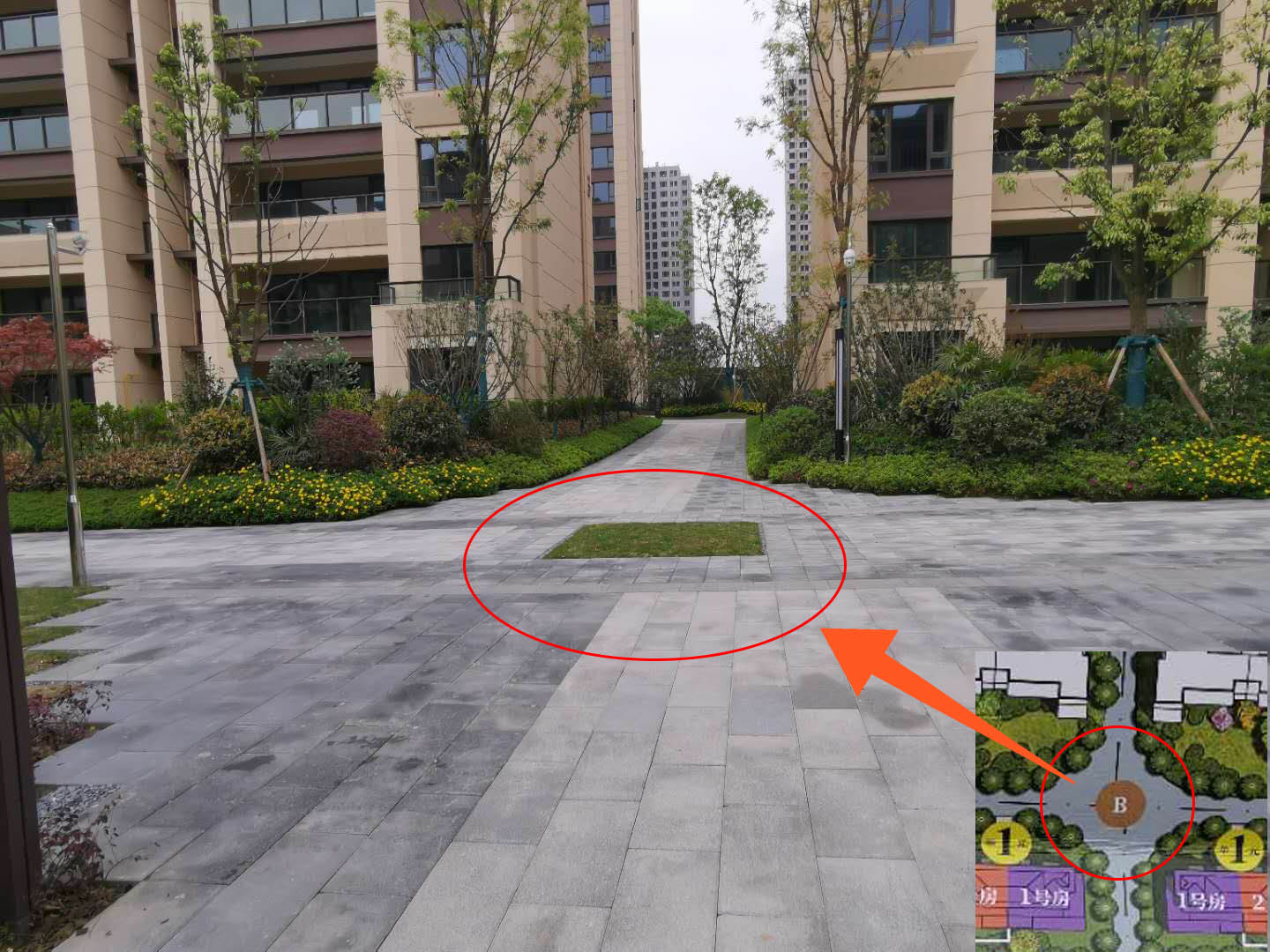 规划图上应是“中心花园”的位置,只有一块长宽3米左右的正方形草坪,怎么看都不像个“花园”。本应是“翠竹石庭”的位置既没有竹子也没有石庭。而本应是“艺术庭园”的位置也是一块普通的草坪。