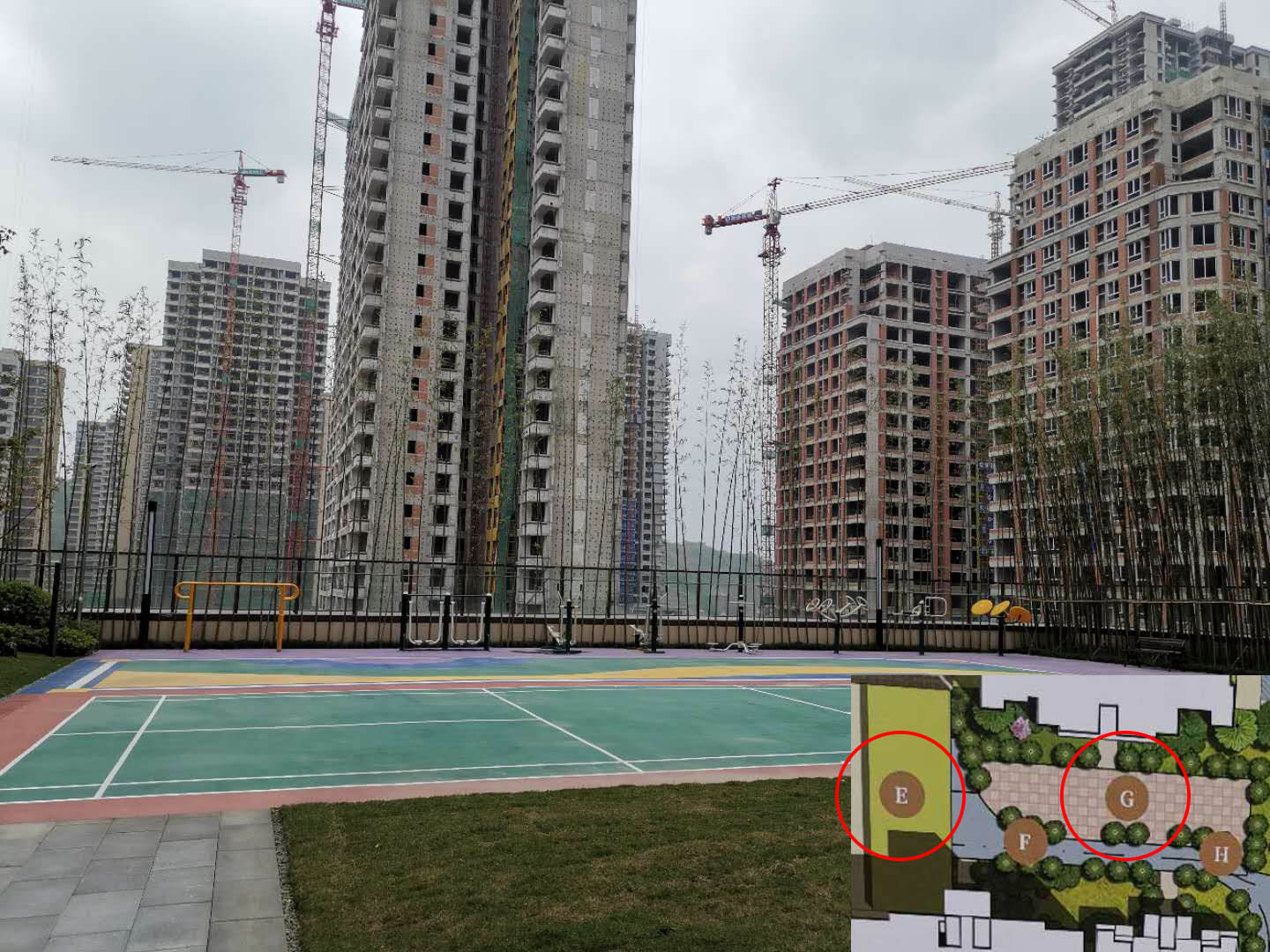 在洋房和别墅之间,界面重庆发现,现实中“儿童活动场地”里摆放着很多健身器材,而规划中的“健身场地”在现实中是一片绿植;涌泉、枯山水等景观则不见踪影;规划中标示的一处“会客花园”位置,现实中只看到一把装饰性的长椅,不知道这是否就算“会客花园”?