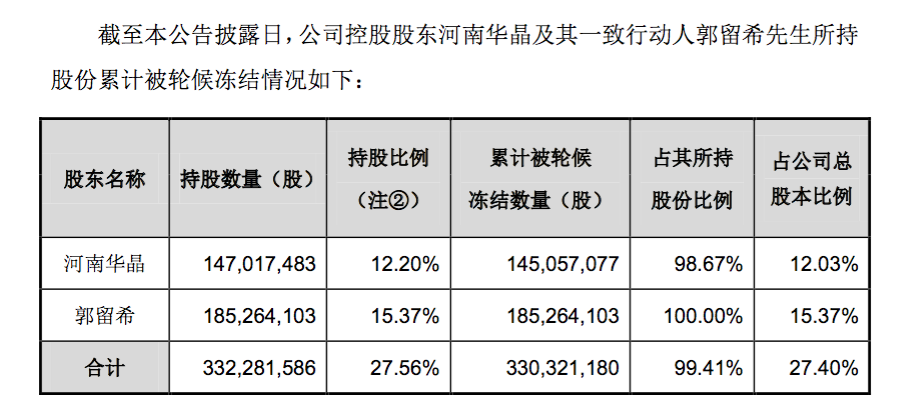 截止3月26日,郭留希累计被轮候冻结股份数量1.853亿股,占其所持有股份的100%,占公司总股本比例的15.37%;河南华晶累计被轮候冻结股份数量1.451亿股,占其所持股份比例的98.67%,占公司总股本比例的12.03%。