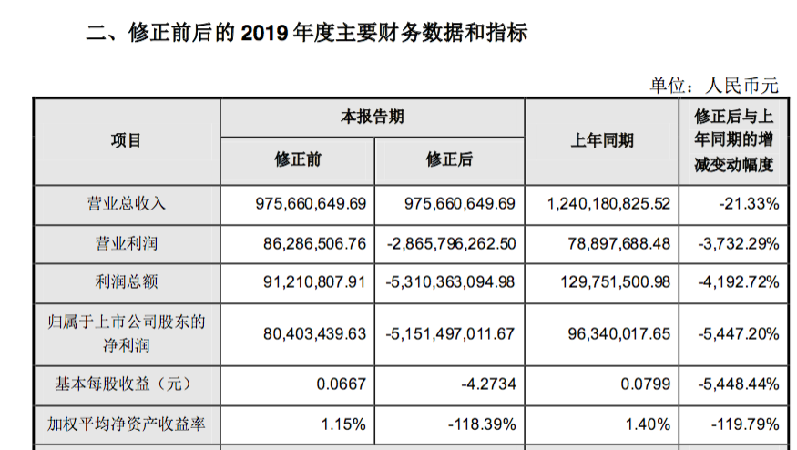 2月29日,豫金刚石发布的2019年业绩快报显示,报告期内公司实现归属于上市公司股东净利润为8040.34万元。修正后,这一数字跌至巨亏51.52亿元。