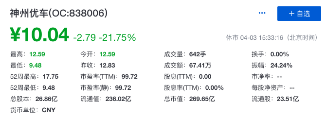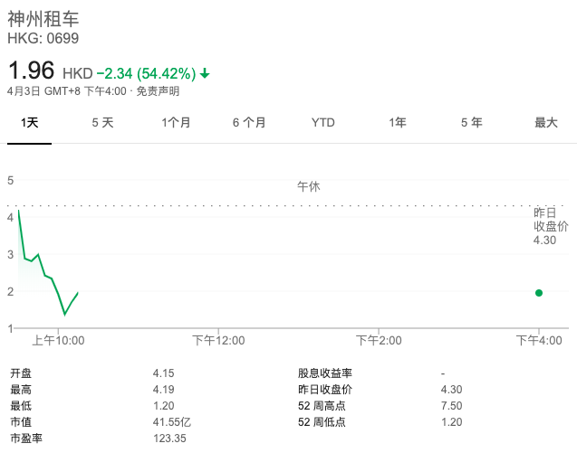 4月3日,在港股上市的神州租车暴跌54%,每股跌至1.96港元,刷新历史最低价。开盘不久后,神州租车对外发布公告,暂停交易。在新三板上市的神州优车则大跌21.75%,股价跌至9.5元,创下历史新低。