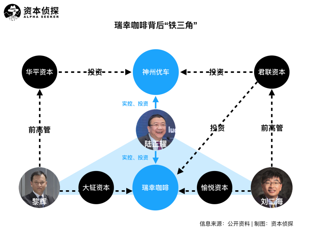 陆正耀为瑞幸投入了大量早期资金:2017年不到1亿元,2018年约1.5亿元。黎辉在2016年到2017年就是神州优车的副董事长,负责神州优车的战略和资本运作。在离开神州后,黎辉创办了大钲资本,刘二海则在离开君联资本创办了愉悦资本,这两家都是瑞幸的重要投资方。此外,刘二海的前东家君联资本也出现在了瑞幸的A轮融资中。
