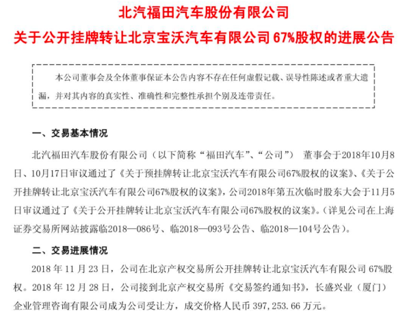 2018年,长盛兴业(厦门)企业管理咨询有限公司(以下简称长盛兴业)以约39.73亿元的价格成为宝沃汽车67%股权的受让方。神州优车作为担保方,为福田汽车向宝沃提供的股东借款提供担保,担保金额不超过24亿元(含24亿元)。