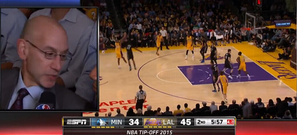 在这场揭幕战的直播画面里还出现了一段很值得玩味的镜头:比赛第二节,当直播画面切换为双屏,左边画面里的NBA总裁亚当·萧华,这个接替了从乔丹到科比执掌NBA30年的大卫·斯特恩的总裁之位的男人,在跟记者交流时,右边画面里科比迎着森林狼22号球员2014年的选秀状元安德鲁·维金斯的封盖就是一记3分跳投,皮球划过一道漂亮的弧线应声入网,似乎是在表达科比对职业生涯行将终结的不甘与落寞。