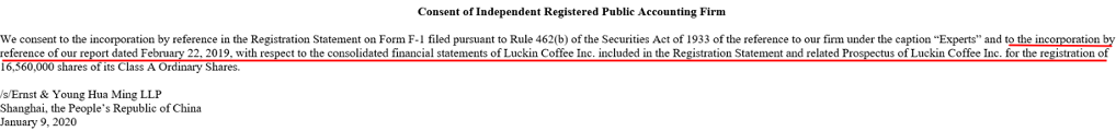 而在2020年1月,瑞幸在发行可转债及公开发行过程中,则是直接获得了会计师的同意信(Consent Letter),使用和IPO同样审计期间的财务数据,而补充披露的2019年的季度财务数据,则是和季度业绩报告一样的未经审计数据。