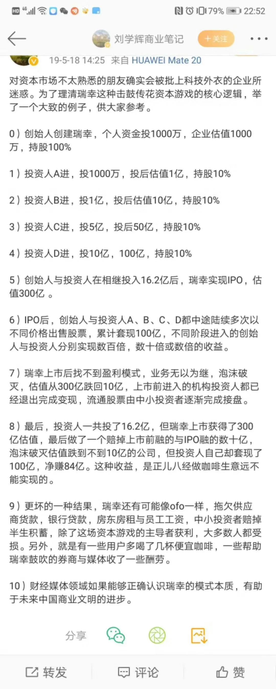随着一些信息陆续披露和一些分析评论的跟进,从这些内容来看,可以看得到在资本的推动下,是如何系统地进行击鼓传花游戏的设计的。进而,我们可以认为,瑞幸的故事是一场更高水平的旁氏骗局也不为过。