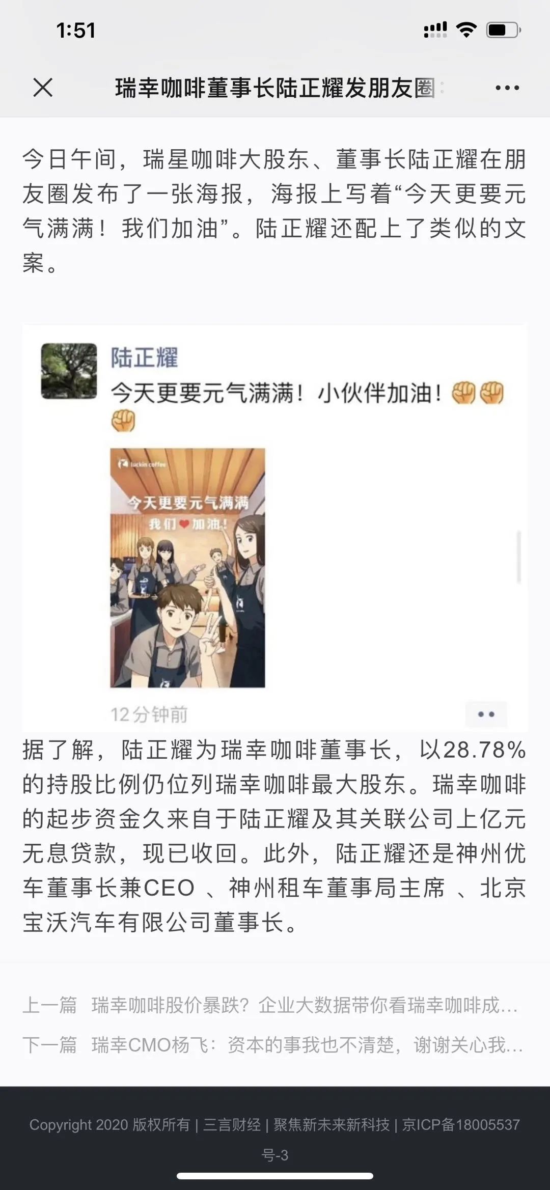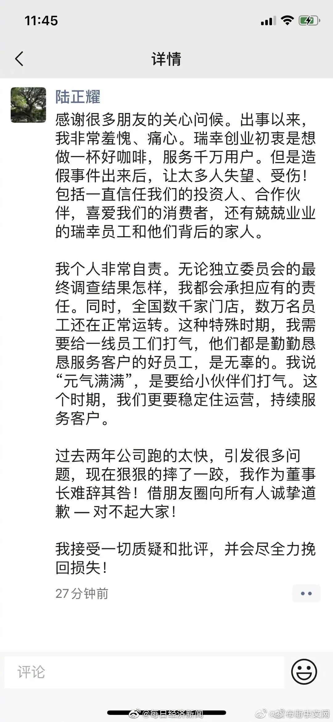 面对瑞幸正在遭遇的危机,据说,瑞幸创始人在朋友圈里发出了更要元气满满的倡议。